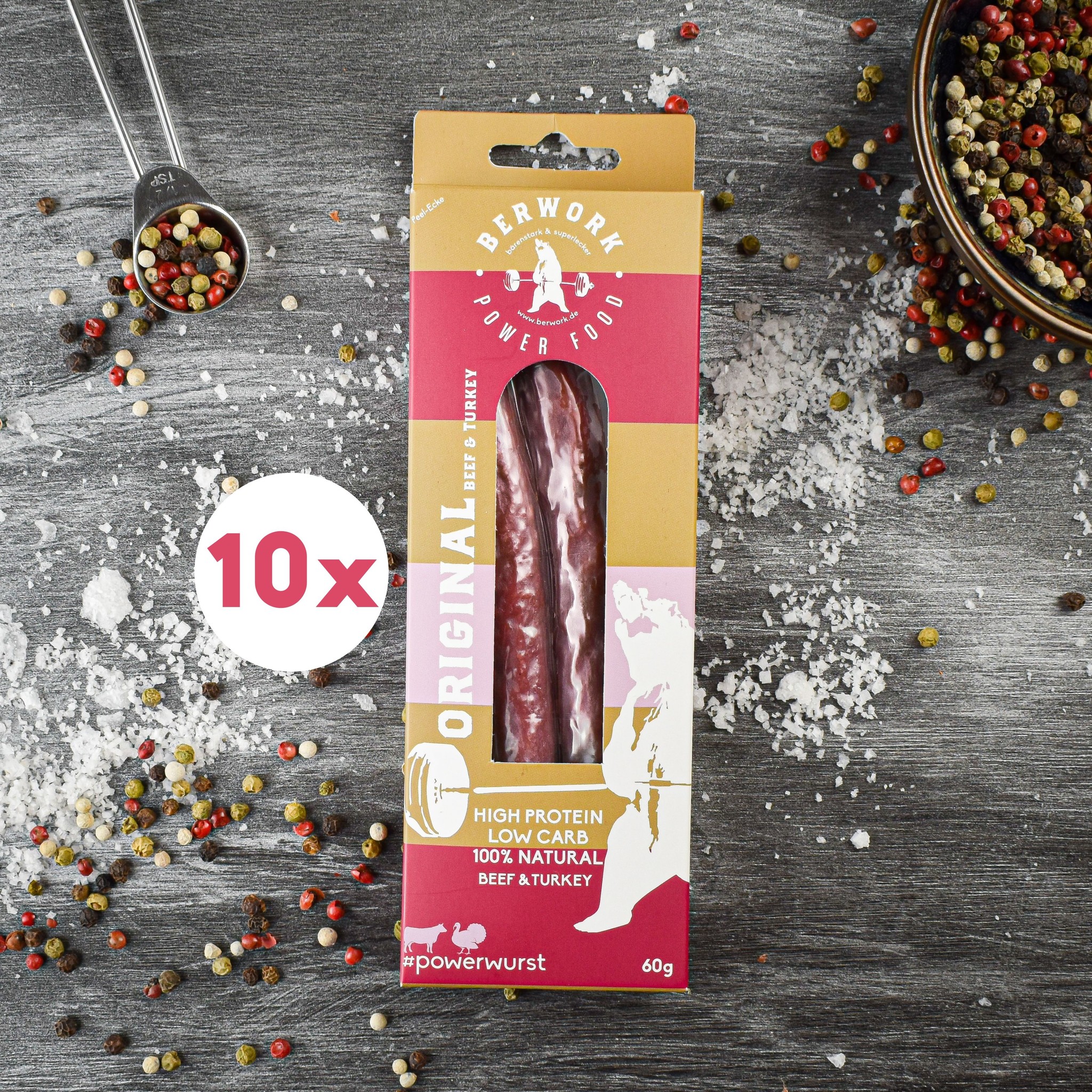 Mit diesem berwork Original Vorratspack erhältst Du 10 Packungen unserer proteinreichen, leckeren Wurstsnacks bequem nach Hause geliefert. Satte 42% Protein, nur 10% Fett, ohne Zusatzstoffe und low Carb! Berwork Original zeichnet sich durch einen einzigartigen Geschmack in Kombination mit Rind- und Putenfleisch und einer würzig, pfeffrigen Note aus!